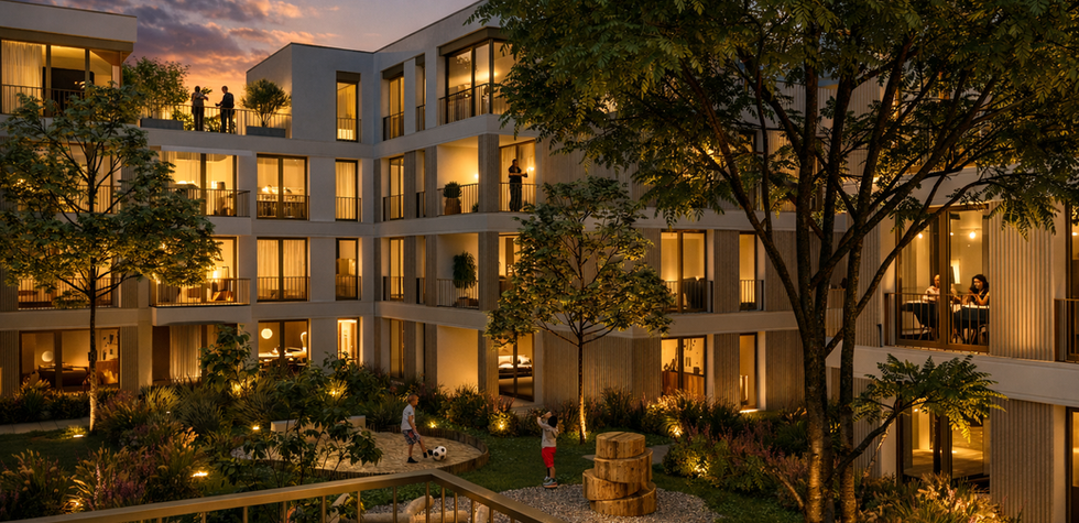 Das rund 4.500 Quadratmeter große Grundstück wird effizient und zugleich wohnfreundlich genutzt. Für den ruhenden Verkehr sind 99 Tiefgaragenstellplätze vorgesehen, die den künftigen Bewohnerinnen und Bewohnern komfortables und witterungsgeschütztes Parken ermöglichen.